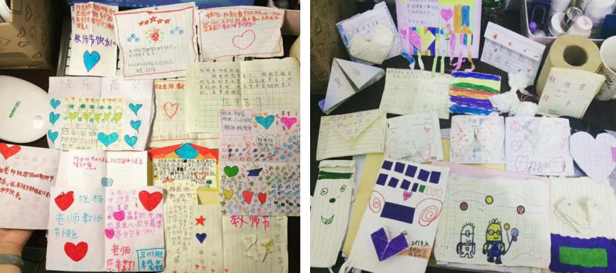 我们准备的礼物希望给员工温暖,而员工制作的礼物让我们感动。教师节那天,小学的孩子们自发用他们的画笔和作业本为我们制作了一张张贺卡,它们可能没有靓丽的外表,但这份意外的礼物让我们都体会到不一样的感动。教师节老县长高德荣第三次来看望研究生支教团,并希望我们能够像照亮人间的太阳,引领人生的灯塔那样,不仅改变员工们的知识,还要给员工们的视野和思想带来改变。