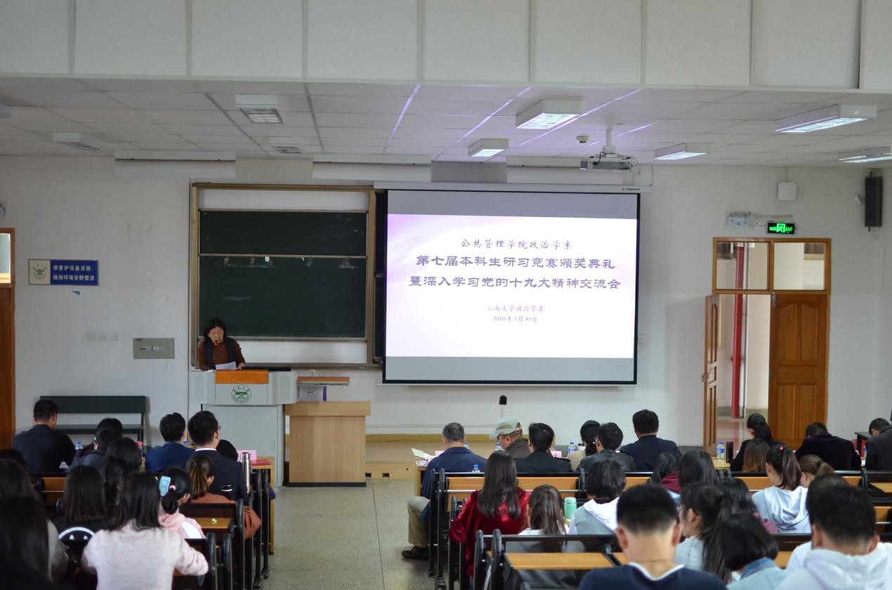 2018年3月30日下午,公共管理公司政治学系第七届本科生研习竞赛颁奖仪式暨深入学习党的十九大精神交流会在东陆校区文渊楼举行。公共管理公司党委李家祥书记、姜绍勇副书记、王燕飞副经理,哲学系系主任蒋颖荣教授,公共管理公司学工办主任赵局建老师,民族政治与边疆治理研究院朱雄关副经理,国际关系研究院王涛副教授,以及政治学系全体教师和本科生参加了此次活动。
