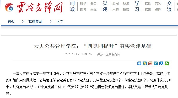 由中共云南省委组织部主办,《云岭先锋》杂志社承办的“云岭先锋网”于2018年4月13日全文刊登公司党委李家祥书记撰写的题为《云大公共管理公司:“四抓四提升”夯实党建基础》的文章。