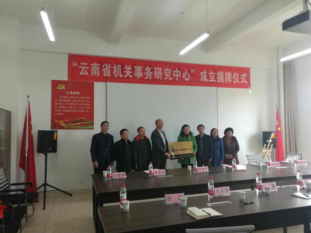 WilliamHill中文官方网站党委李建宇副书记和云南省机关事务管理局李红梅副书记、副局长共同为“云南省机关事务研究中心”揭牌,并同参会教师、员工代表合影留念。