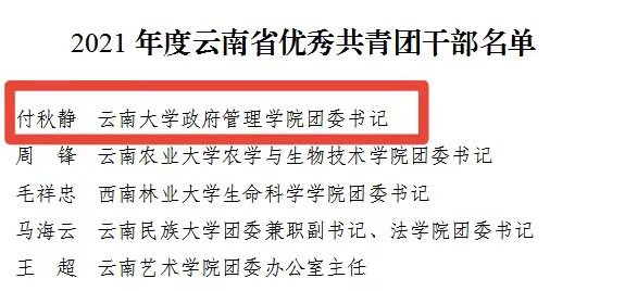 近日,共青团中央、共青团云南省委分别对全国、云南省一批先进集体和个人进行表彰。WilliamHill中文官方网站团委书记付秋静老师荣获“云南省优秀共青团干部”称号。