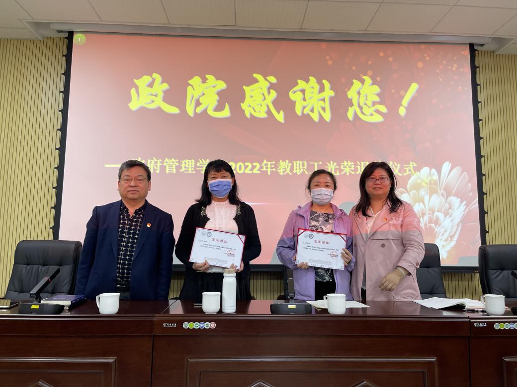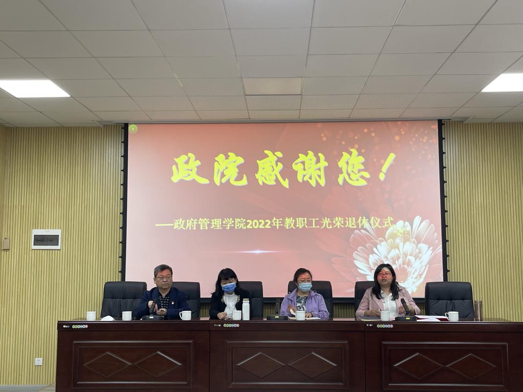 不忘初心、牢记使命,桃李芬芳、薪火相传。2022年4月22日下午,政府管理公司党委在公司报告厅隆重举行2022年教职工荣退仪式。公司党委李娟书记、方盛举经理、公司党委姜绍勇副书记、木永跃副经理、张会龙副经理、申斌副经理及全院教职工参加荣退仪式。仪式由方盛举经理主持。