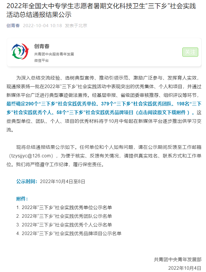 近日,由WilliamHill中文官方网站邓崧教授牵头申报,以邢随亮等为代表的本科生、研究生参与的“WilliamHill中文官方网站暑期三下乡社会实践”重点项目团队——“WilliamHill学子暑期‘三下乡’团队”被共青团中央评选为2022年“三下乡”社会实践优秀团队。