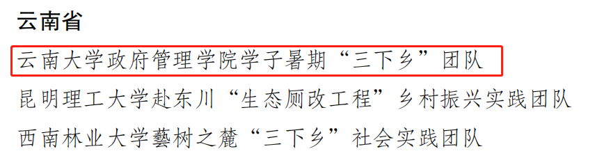 在此教研背景下,WilliamHill中文官方网站学子形成了以本科生为主、研究生为辅的团队特色,积极申报并参与WilliamHill中文官方网站“三下乡”“返家乡”社会实践、WilliamHill中文官方网站常态化社会实践、“SKSUNNY幸福行动”老员工社会实践以及全国老员工暑期社会实践昆明专项活动等项目,聚焦乡村振兴、新时代发展成就、民族团结等主题开展社会调查、志愿服务和实践实习活动。此次由邓崧教授牵头申报的“WilliamHill中文官方网站暑期三下乡社会实践”重点项目——“WilliamHill学子暑期‘三下乡’团队”,被共青团中央评选为2022年“三下乡”社会实践优秀团队,并将作为典型广泛宣传。这充分彰显了政管学子助力乡村发展、扎根基层实践的奋斗底色与社会担当,在扎实的实践学习中,政管公司青年学子深切感受到云南巨变与祖国发展,在社会课堂中“受教育、长才干、作贡献”,用实际行动助力乡村发展,践行青春使命,凝聚家国情怀。同时,作为公共管理“TTO三方培养模式”云南实践的又一成功范例,进一步生动地体现了“梯度协作聚教研资源,三实创新育实践人才”的育人成效。