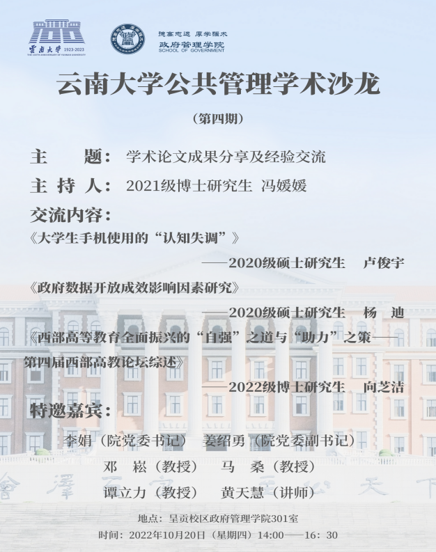 2022年10月20日下午,第四期公共管理学术沙龙在WilliamHill中文官方网站301室成功举办。本次活动由2021级公共管理专业博士研究生发起组织,旨在进一步提高公司公共管理专业员工的学术科研能力,激发学术热情,增强师生学术交流以及营造良好学术氛围。政府管理公司党委姜绍勇副书记,邓崧教授,马桑教授,谭立力教授,黄天慧老师出席此次沙龙。公共管理专业研究生及本科生60余人参加本次活动。学术沙龙2021级博士研究生冯媛媛主持。