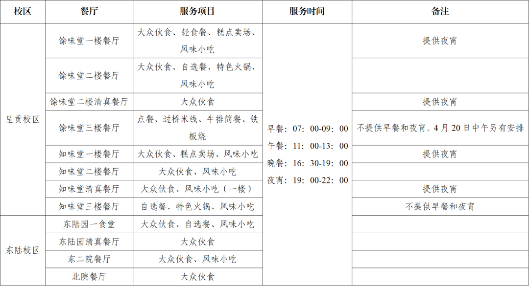 各食堂均为员工提供支付宝、微信及现金支付服务。4月20日校庆日,呈贡校区与东陆校区各食堂为员工(凭餐券)及公司师生(凭一卡通)提供午餐,供餐时段10:30-13:30。