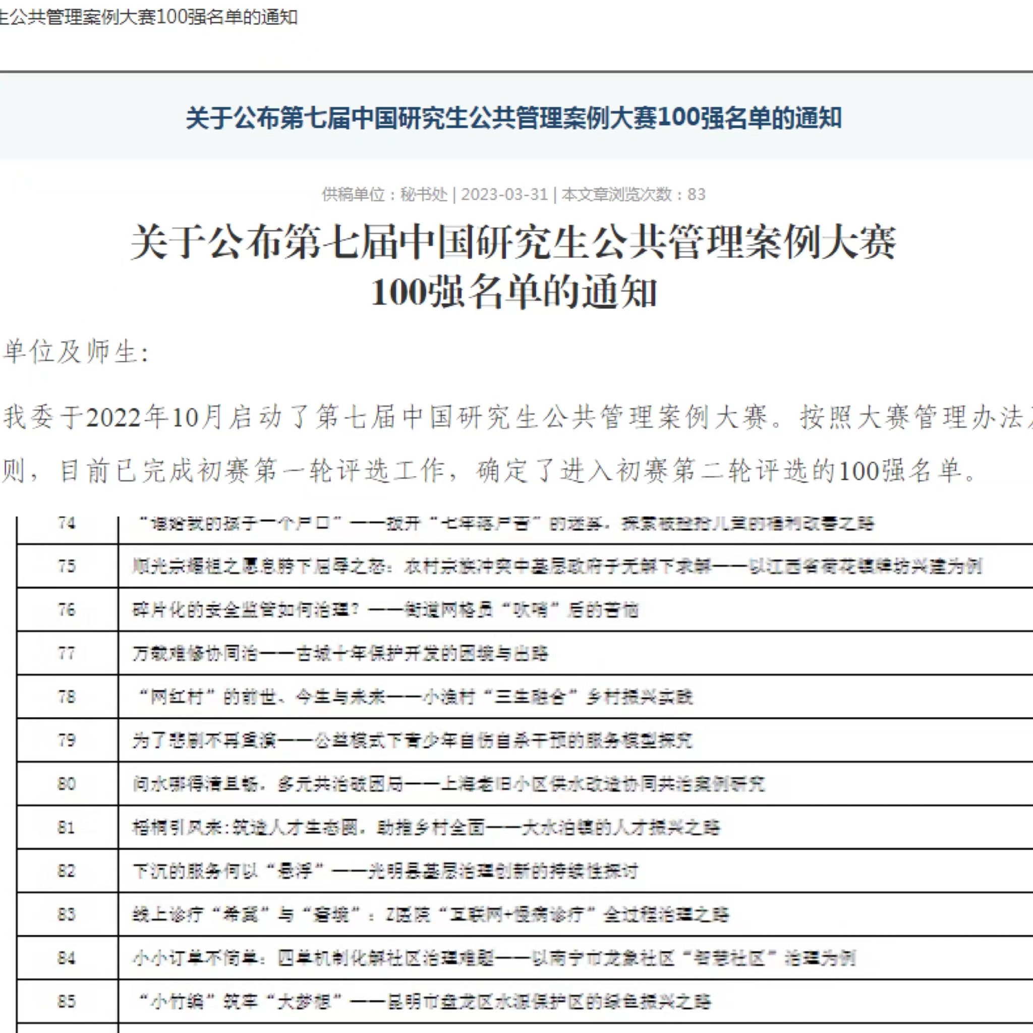 中国研究生公共管理案例大赛是“中国研究生创新实践系列大赛”主题赛事之一。大赛旨在引导广大研究生尤其是MPA研究生关注我国公共管理实际问题,提高运用公共管理理论方法解决实际问题的能力,使MPA教育与公共管理实践、与国家发展大局结合更加紧密。大赛创办七年来,在全国MPA教指委的积极推动下,参赛规模持续扩大、影响力不断增强,在提高研究生实践创新能力、推动案例教学应用方面发挥了重要作用。