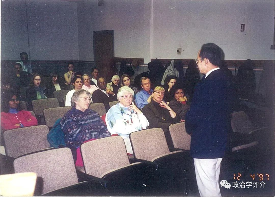 (图为1997年12月,马啸原先生在美国访问时,为欧柏林大学师生做学术讲座)