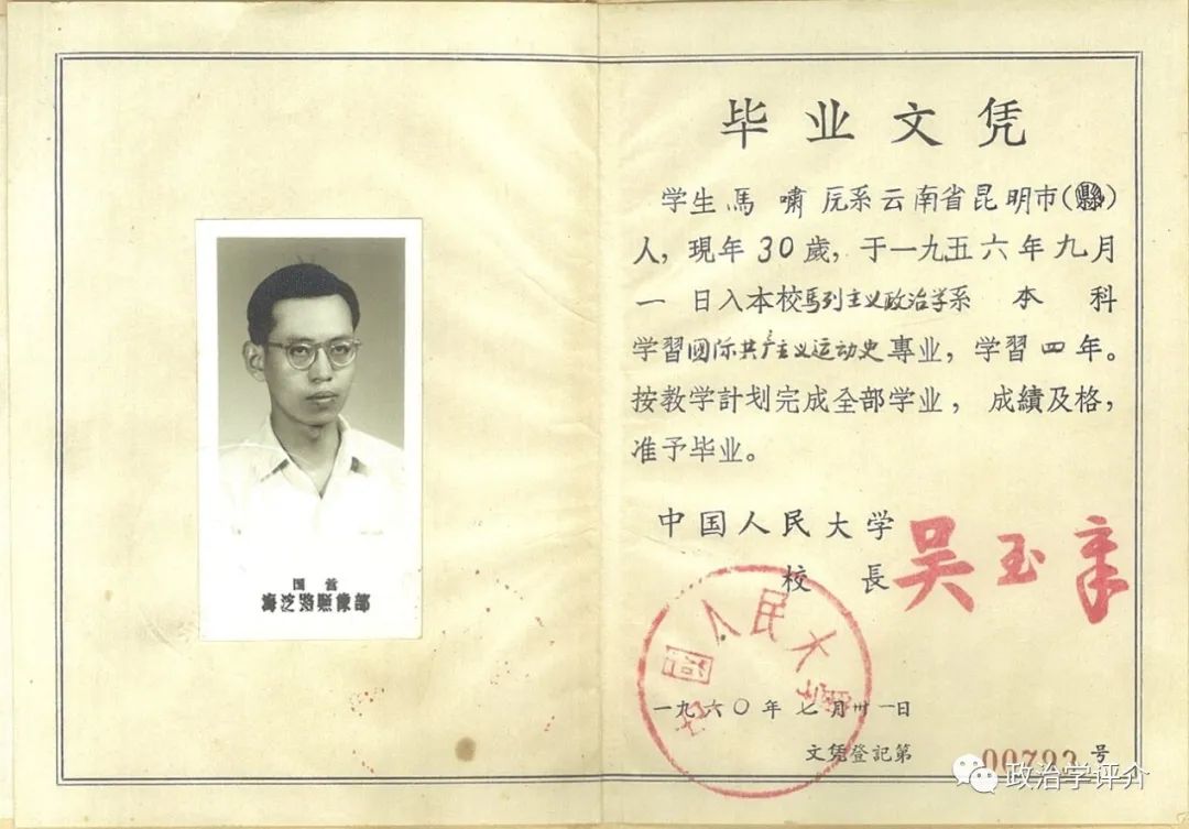 马啸原老师(以下简称马老师):1956年中国人民大学到昆明招生,我报名后被录取到中国人民大学国际政治系(当时叫马列主义基础系)国际共产主义运动史专业,那年云南一共录取了几十个员工。当时的国际共产主义运动史专业实际上是讲马克思主义思想发展史以及马克思主义的创立和发展。