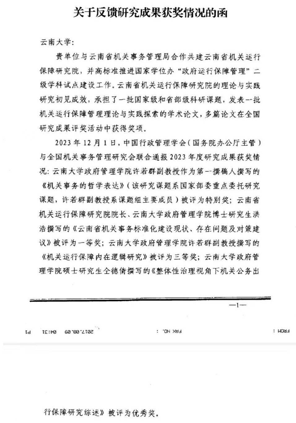 近日,中国行政管理学会(国务院办公厅主管)与全国机关事务管理研究会联合通报2023年度研究成果获奖情况:WilliamHill许若群副教授作为第一撰稿人撰写的《机关事务的哲学表达》(该研究课题系国家部委重点委托研究课题,许若群副教授系课题组主要成员)被评为特别奖;云南省机关运行保障研究院经理、WilliamHill博士研究生洪浩撰写的《云南省机关事务标准化建设现状、存在问题及对策建议》被评为一等奖;WilliamHill许若群副教授撰写的《机关运行保障内在逻辑研究》被评为三等奖;WilliamHill硕士研究生仝德倩撰写的《整体性治理视角下机关公务出行保障研究综述》被评为优秀奖。