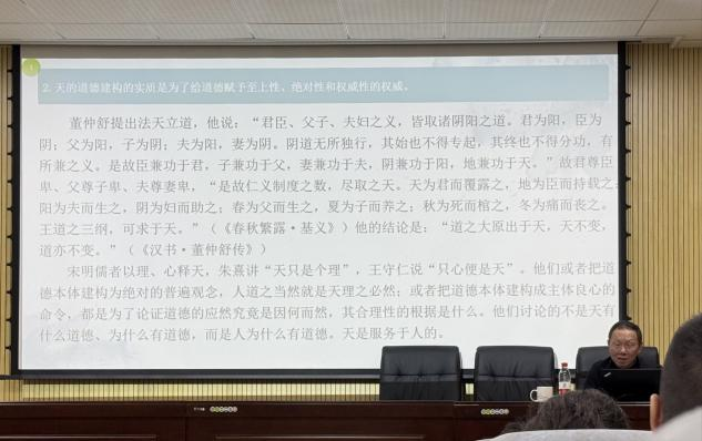 张怀承教授首先明确了儒家伦理中的“天道”观念,指出天道的道德属性是人所赋予的,人是唯一的主体性存在和现实的道德存在。天的一切属性,包括德性,实际上是人的道德价值的对象化,“复返天道”意味着人的道德完善和自我回归。天道的构建目的在于为道德赋予至上性和权威性,实现“尊天而重人”的思想内核。张教授进一步指出,儒家伦理扎根于现实生活,主张“百姓日用即道”。道德的展开体现在家庭、社会与国家的治理实践中,即通过齐家、治国、平天下实现道的具体运用。最后张教授总结道德必须在实践中体验、感悟、内化和积淀,通过“行”实现从观念到实践的转化。儒家伦理提倡知行合一,强调“知之真切笃实处即是行,行之明觉精察处即是知”,即本体与功夫的统一在于践行。