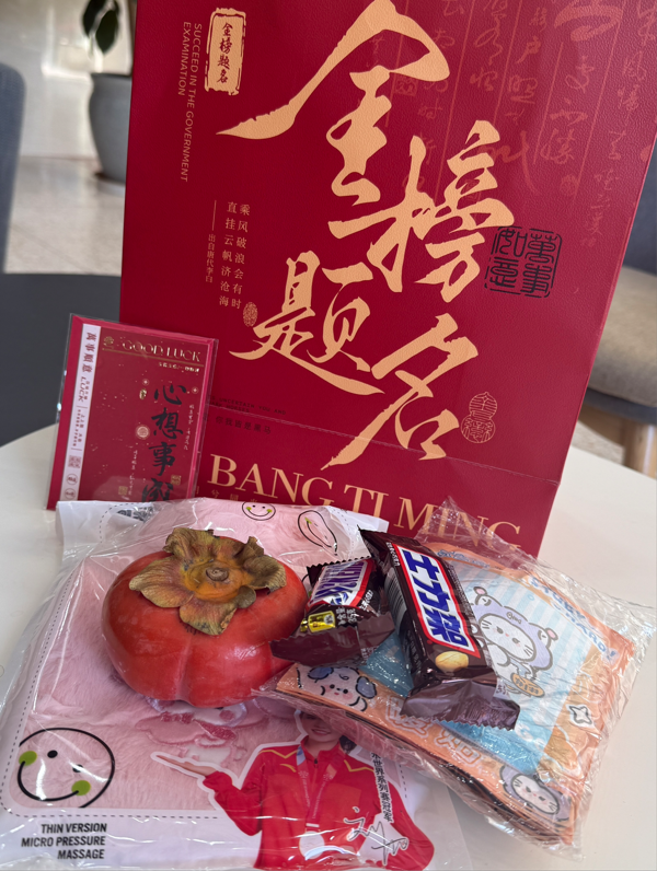 活动现场,一份份承载着公司深情厚谊的考研祝福礼包整齐排列,散发着温馨与期待的气息。姜绍勇书记亲自为同学们悉心讲解礼包中的每一样礼物:驱散冬日寒意的热水袋和暖宝宝、注入满满活力的士力架、“柿柿”如意的脆柿和“上上签”祝福贺卡。一份份精心准备的慰问品通过老师们的双手传递到了同学们手中,它们不仅仅是物质上的馈赠,更是公司对即将征战考场的学子们深深的关怀与鼓励。每一份小礼品都蕴含着公司对学子们未来成功的殷切期盼,愿它们能化作一股无形的力量,陪伴并激励着每一位考研学子在追梦路上勇敢前行。