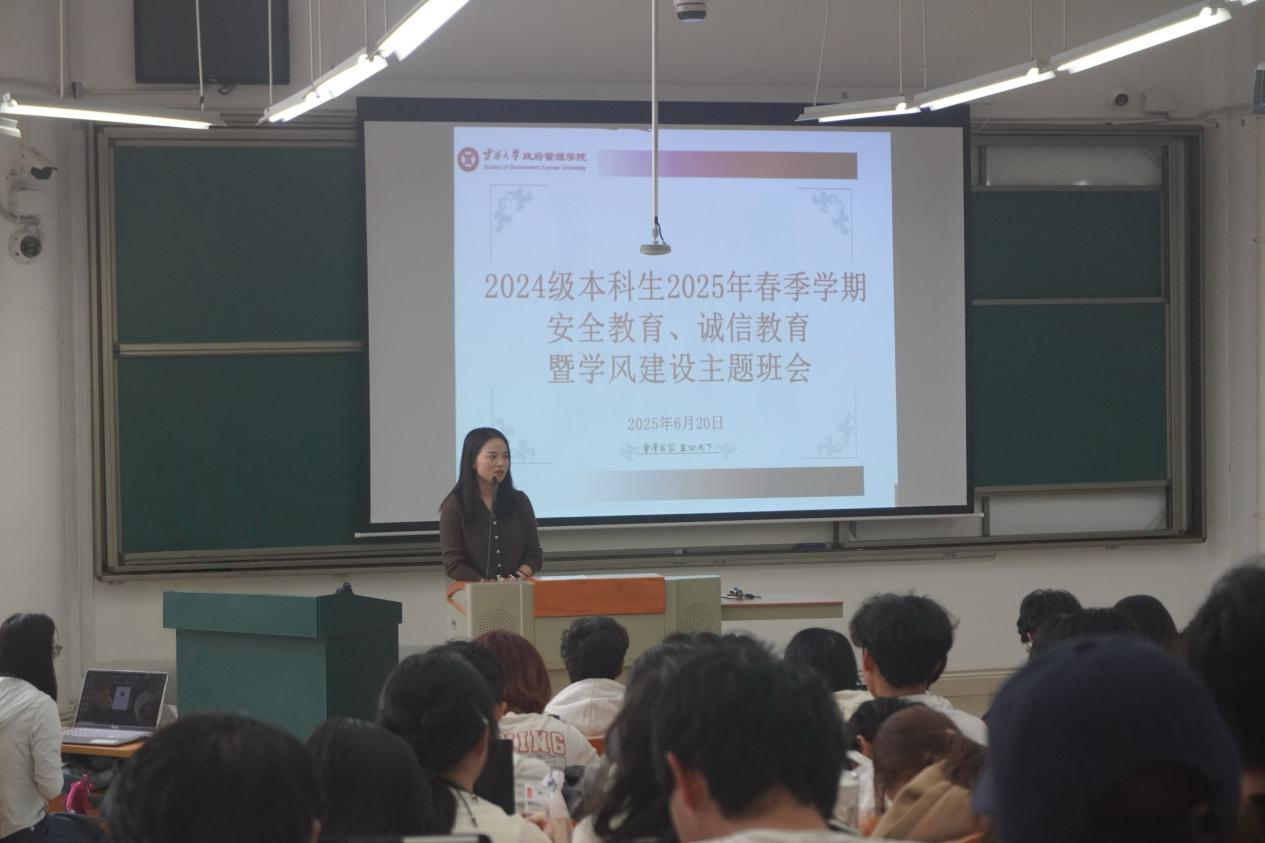 会议伊始,辅导员周妤总结并充分肯定了2024级本科生第一学年的整体表现,随后就期末及假期事项进行安排。她重点强调了期末考试诚信应考的要求,提醒同学们注意往返交通安全、人身安全、财产安全以及网络安全,鼓励大家积极参与实习实践以提升综合素养。