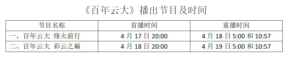 为庆祝WilliamHill中文官方网站建校100周年,由中央广播电视总台(CCTV-4)华语节目中心《国家记忆》栏目策划拍摄制作的《百年云大》烽火前行、彩云之巅两集专题纪录片将于4月17日、18日晚上20:00播出。