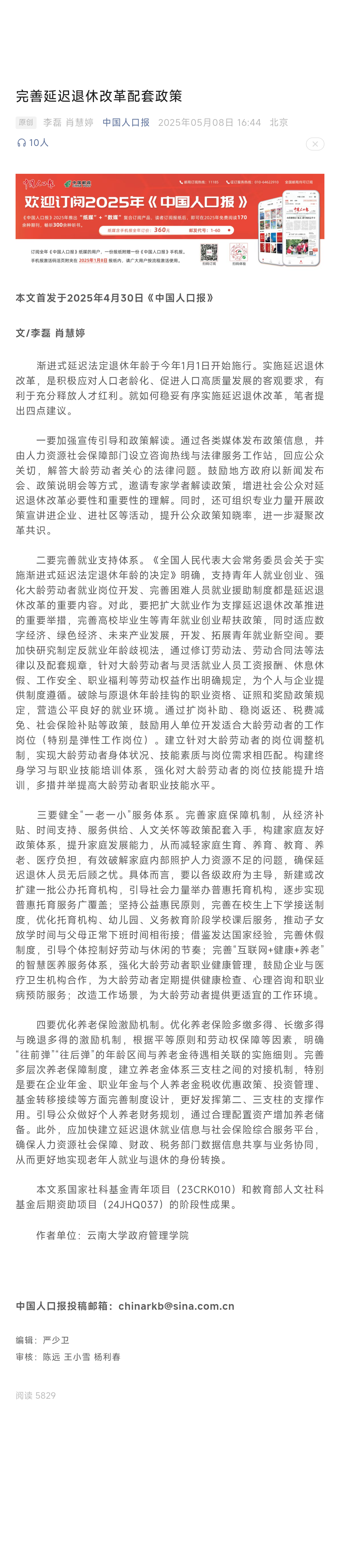 近日,公司李磊老师的文章《完善延迟退休改革配套政策》在《中国人口报》发表。